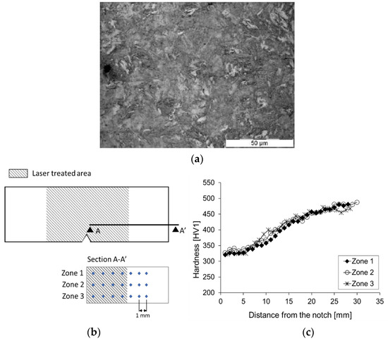 The width of the generated transition zone was evaluated on the SENB samples, where the treatment had only been applied to the section corresponding to the sample notch (see Figure 4b). The hardness profiles were extracted from the center of the laser-treated zone in the SENB specimens, as illustrated in Figure 6b. Three rows of indentations were performed on a cross-section of the specimen: two were close to the specimen surfaces (approx. 1 mm from the outer surface) and one was in the mid-thickness. The hardness profiles (Figure 6c) show a homogeneous through-thickness hardness distribution and a transition zone approximately 20 mm wide from the center of the specimen.