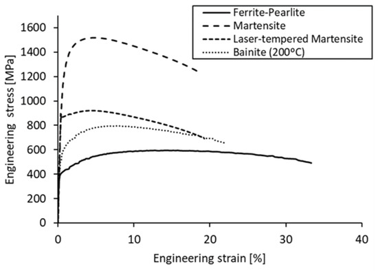 Figure 7 shows the engineering stress-strain curves for the studied microstructures. The tensile properties are shown in Table 3. As expected, the fully martensitic microstructure shows the highest strength, reaching the full 1500 MPa UTS that can be expected in 22MnB5; this shows, that despite the high thickness, the samples were satisfactorily quenched. The laser-Tempered Martensite shows a significant decrease in strength, but no noticeable gain in ductility. The Bainite and Ferrite-Pearlite show much lower strength values. It should be noted that the elongation at the fracture is only comparative and should not be taken as an absolute value because the test samples could not be manufactured in a standardized geometry due to equipment limitations.