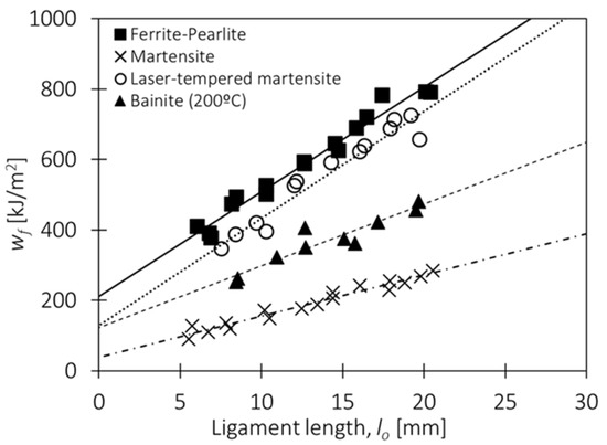 This is despite showing a very different behavior during the test, in which the Laser Tempered samples showed greater displacement at the fracture and higher wf values than the Bainite for the same ligament length. Nevertheless, in the Laser-Tempered microstructure, the fracture energy has a greater contribution from the non-essential plastic work (βwp), as pointed out by the slope of the linear regression.