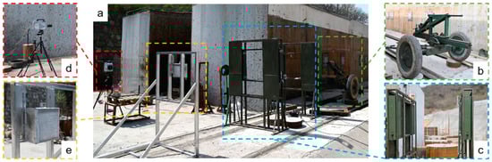 Figure 2. (a) The layout of the experimental test system. (b) The 12.7 mm caliber ballistic gun. (c) The six-channel velocimeter. (d) The FASTCAMSA-Z high-speed camera. (e) The fuel tank.