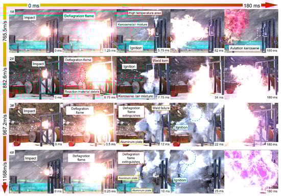 Figure 3. The ignition phenomena of the PABs impacting the fuel tanks at different velocities: (1#) 765.5 m/s, (2#) 882.6 m/s, (3#) 967.2 m/s, and (4#) 1168.0 m/s.