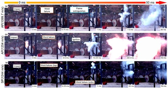 The phenomena of aluminum projectiles (APs) and the steel projectile (SP) impacting the fuel tanks are shown in Figure 4. When the AP impacted the fuel tank at a velocity of 1099.7 m/s (5#), the AP collided with the front aluminum plate on the fuel tank to engender a weak flame, which quickly vanished in less than 1 ms. At 0.75 ms, the fuel tank welds were cracked, and the fuel tank structure was damaged. Then, a large amount of atomized kerosene sprayed around, but the ignition failed. When the velocity increased to 1254 m/s (6#), the flame range induced by the AP became larger, and the weld was cracked in a shorter time (0.5 ms). Then, the structure of the fuel tank was completely damaged, and the kerosene/air mixture was ignited in the front of the fuel tank at 10.25 ms. The SP impacted the fuel tank at a velocity of 1244 m/s (7#) to produce a weak firelight, which disappeared in less than 0.25 ms. Since the impact position was close to the upper part of the fuel tank, the weld on the top of the fuel tank was damaged first, followed by the cracks on the side weld, and the kerosene ejected outward without being ignited.