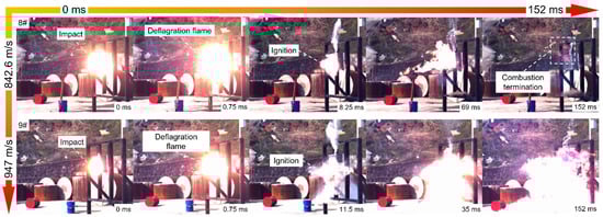 Figure 5. The ignition phenomena of the PABs impacting the fuel tank filled with 50% kerosene at different velocities: (8#) 842.6 m/s and (9#) 947 m/s.