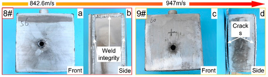 Figure 6. The damage behaviors of the fuel tanks filled with 50% kerosene when PABs impact at different velocities: (a) front of 8# fuel tank, (b) side of 8# fuel tank, (c) front of 9# fuel tank, and (d) side of 9# fuel tank.