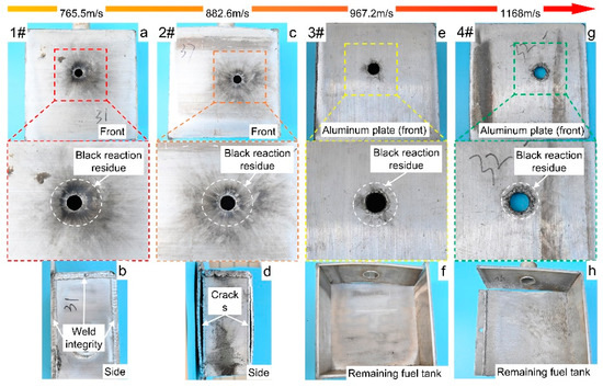 Through the comparative tests 1#–4#, it was discovered that the increase of velocity intensified the damage of PAB to the fuel tank structure. Figure 7 shows the damage behaviors of the fuel tanks after PAB impacted the full fuel tank at different velocities. At the beginning, the impact velocity of the PAB was low (1#), which was not enough to break the weld of the fuel tank (Figure 7b). With the increase of impact velocity (2#), PAB could split the weld (Figure 7d). When the velocity was further increased (3# and 4#), the structure of the fuel tank was completely ruptured (Figure 7f,h). This can be explained as follows: on the one hand, the increase of velocity caused PAB to release greater kinetic energy in the fuel tank, and on the other hand, the subsequent reaction zone released more energy with the increasing velocity [24]. Therefore, under the dual-promotion of kinetic and chemical energy, the fuel tank structure will suffer more serious damage.