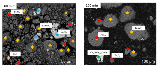 The mineral composition distribution of the roasted precipitate was determined by EMPA. The EPMA photos of the precipitate roasted at different times are presented in Figure 15. According to the previous experiments above and the EPMA photos, the following was observed: (1) During the early stage of the reaction, a large amount of FeAsO4 was decomposed into As2O3 and Fe3O4. At 60 min, As2O3 was obviously detected in the roasted precipitate. As2O3 was volatilized into dust, and at the same time, Fe3O4 was generated. (2) In the middle and late stages of the reaction, FeAsO4 was continuously decomposed and reduced, and the content of Fe3O4 was continuously increased until all iron was magnetized to generate Fe3O4, and the decomposed As2O3 volatilized into the dust. After 100 min, As2O3 could no longer be detected in the precipitate. This is because As2O3 was volatilized immediately when it was formed due to the volatile property of As2O3. (3) A small amount of arsenic reacted with CaO to generate Ca3(AsO4)2. As time extended, the arsenic content in CaO increased significantly, and the generation of Ca3(AsO4)2 may be the reason why the arsenic content in the final product was still 0.60%.