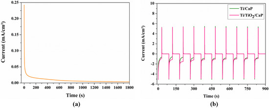 (a) Chronoamperometric graphs of titanium oxidation deposition. (b) Pulsed chronoamperometric graphs of calcium phosphate deposition.