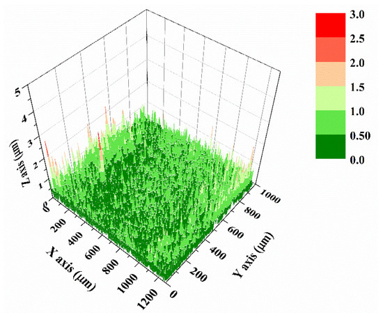Surface topography was evaluated using confocal microscopy to determine how the electrodeposition process affects the sample roughness. This parameter influences the interaction and attachment of the cell on the implant surface [36,37]. In addition, electrolyte penetration on the material is affected due to the distribution of valleys and pores [38].