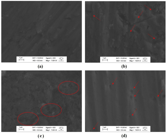 The variation in the surface roughness and the formation of coatings layers are corroborated by the distinctive rough areas observed by scanning electron microscopy in Figure 3.