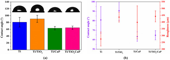 In Figure 5b, it can be observed that, despite maintaining high roughness, both CaP alone and CaP with TiO2 decrease the contact angle, becoming more hydrophilic when compared with the Ti/TiO2. The hydrophilicity can enable more excellent cell anchoring, a requirement for biomaterials.