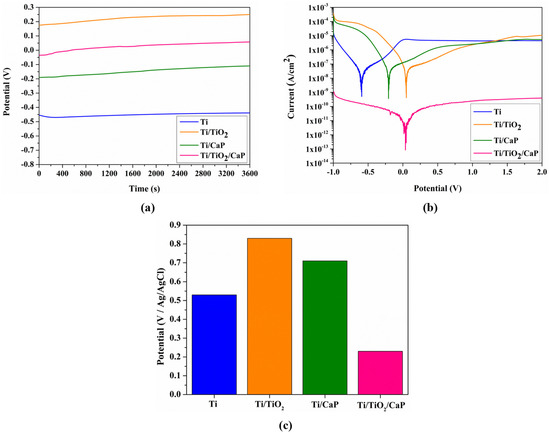 First, the open circuit potential was recorded during 3600 s in PBS, presented in Figure 6a, and the final OCP at the end of 3600 s is described in Table 2. It can be observed that the uncoated sample (Ti) presents the lower OCP, with a slight decrease in the first 500 s and posterior stabilization in –0.439 V. In contrast, all coated samples presented a similar behavior with a constant increase in the OCP value to the anodic direction, with the Ti/TiO2 and Ti/TiO2/CaP samples presenting positive values of 0.250 V and 0.058 V, respectively. A similar tendency can be observed in the Ti/CaP sample; however, despite the modest increase in the OCP, it continues in the negative value with −0.110 V.