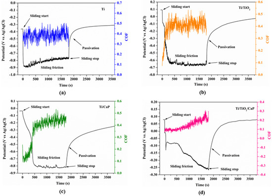 In Figure 10a, the first zone, called the film, is related to the period during the tests in which the coating supports the applied load. The second zone, called film/bulk, is associated with the period in which the beginning of coating degradation occurs consequentially to the fall of the OCP and increase in the P. Finally, the third zone, called bulk, is delimitated by the stability of the OCP in values approximately −0.7 and P with values near the titanium without coating.