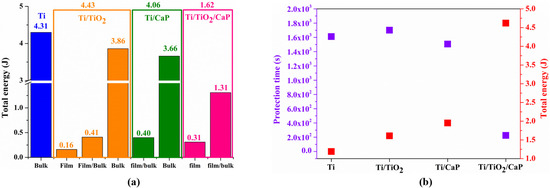 Figure 10a shows the obtained data from the total amount of energy during the 1800 s and a comparative protection time due to coating response. The total amount of dissipated energy was compared in the four groups. There are visible significant differences in the sample coated with TiO2 presenting a higher ET. The ET in the Ti/TiO2/CaP sample decreased by 63.43% compared to Ti/TiO2. The ET variation can be associated with the total amount of P dissipated energy in contact with the double layer, which is approximately 0.5 mJ/s.
