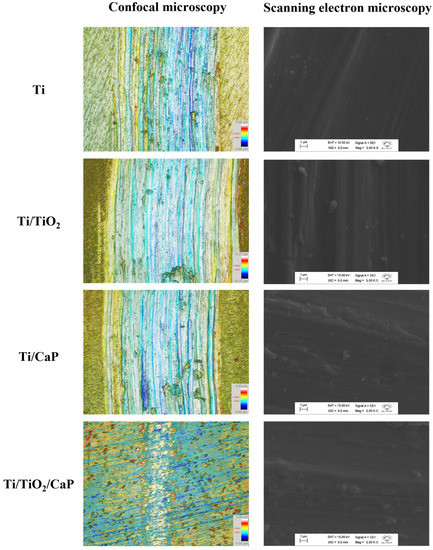 Third, on the CaP-coated samples, the tribocorrosion wear tracks were slimmer when compared with the TiO2-coated samples. However, the CaP-coated surface shows a less homogenous surface among all samples in this study due to the formation of CaP that causes pitting on the titanium bulk even before wear tracking degradation. This phenomenon tends to rip out more pieces on the wear track than it is possible to realize on the confocal and MEV images due to the nonuniform surface and irregular scratches. This correlation of images agrees with the electrochemical analysis in which Ti/CaP samples present high CR.