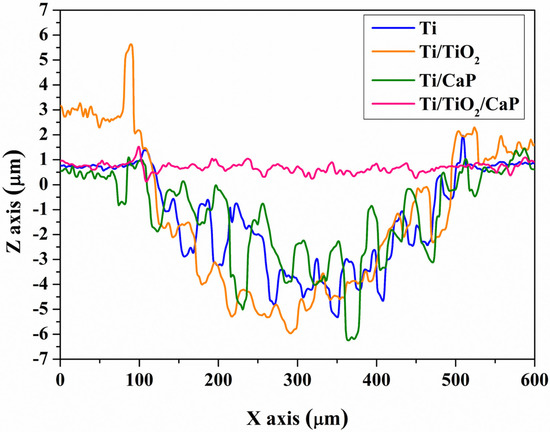 Finally, on the Ti/TiO2/CaP sample, the tribocorrosion wear tracks were slimmer and smoother than all cases in this study, as could be realized on the 2D profile. There is minimal visible damage after sliding wear tests. This information of both confocal and MEV images corroborates with the minor variation in the OCP and greater passivation. In addition, the Ti/TiO2/CaP group can be observed with high protection against tribocorrosion and wear with a minor wear track zone. This pattern agrees with the protection efficiency on electrochemical tests and lowers P, corroborating the beneficial response of two deposition stages, promoting a more stable and resistant layer into titanium surfaces.
