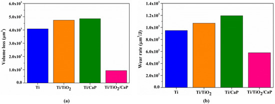 These observations were quantified in the volume loss graph in Figure 13a, where uncoated titanium has 4 × 103 µm3 of volume loss. In comparison, samples with only TiO2 and CaP increase the values to approximately 4.7 × 103 µm3 and 4.9 × 103 µm3, respectively. However, samples with TiO2 and CaP 0.9 × 103 µm3 decreased drastically.