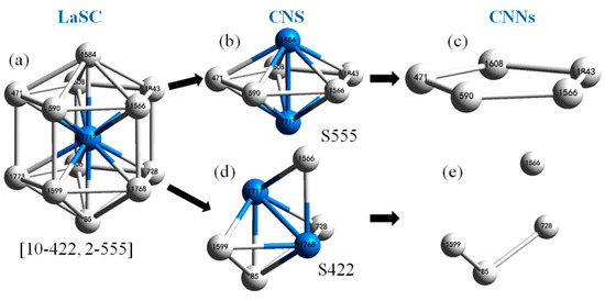 A LaSC can be systematically denoted by a set of binary tuples in the format nh-Sihjhkh, where nh is the number of CNS Sihjhkh types in a LaSC; therefore, CN=Σnh. For example, in the local structure shown in Figure 1a, 2 S555 and 10 S422 can be constructed; thus, it is denoted as (2-555, 10-422). It is easy to prove that a CNS to CNS index is an injective mapping in any LaSC; then, Req. 3 is satisfied.
