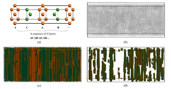 It is very difficult to identify long-range ordered structures (composed of at least two types of LaSCs meeting certain spatial distribution characteristics) using numerical calculation. LaSCA has made some useful attempts recently. As shown in Figure 3a, in the double hexagonal close-packed (DHCP) crystal, the repeating unit consists of four HCP layers, where each atom has six neighbors arranged in equilateral triangles, with the ACAB… sequence. Figure 3b presents the distribution of FCC and HCP atoms within a part of a shocked bulk yttrium initialized as an HCP single crystal [31], where atoms are represented by grey points. When the icosahedron is employed to represent atoms that are color-coded by LaSC types, we arrive at Figure 3c. Subsequently, the DHCP long-range ordered structure analysis is performed and DHCP atoms are plotted in Figure 3d, where the long-range periodicity is evident. Currently, the close-packed Rhombohedral (Sm-type) crystal structure can also be identified; its repeating unit is composed of a sequence of nine HCP layers of ABCBCACAB.