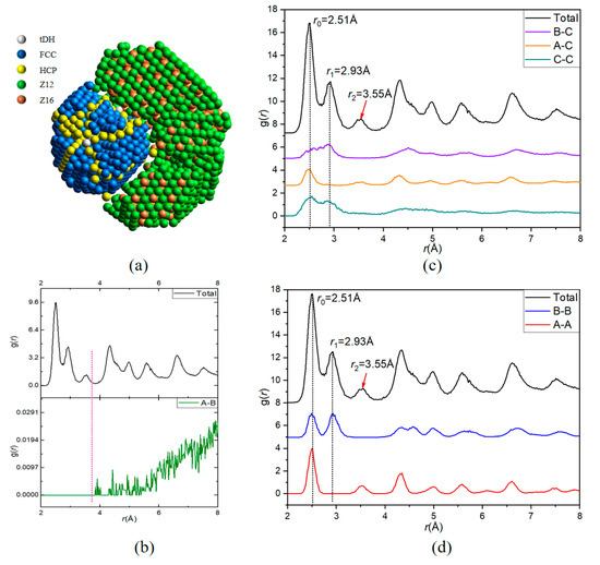 Zero is the height of both the gA-C(r) (Figure 5c) and the gA-A(r) (Figure 5d) at the position of the second peak on the total PDF; thus, A atoms (belonging to the five-fold symmetrical FCC crystalline region) do not contribute to the second peak on the total PDF, because gA-B(r) is also zero at this position (Figure 5a). In other words, the peak at r = 1.167 r0 (r0 = 2.51Å is for the position of the first peak) is caused by TCP structures and the other structures (represented by C atoms). By contrast, only gA-A(r) contributes to the third peak at r = 1.414 r0 on the total PDF (Figure 5d). C atoms have TCP characteristics because gC-C(r) and gB-C(r) contribute to both the first and second peaks, but not to the third peak on the total PDF, whereas gA-C(r) only contributes to the first peak (also slightly to the third peak). Therefore, in combination with the visualization analysis, the pPDF curves can facilitate a better understanding of complex structures.