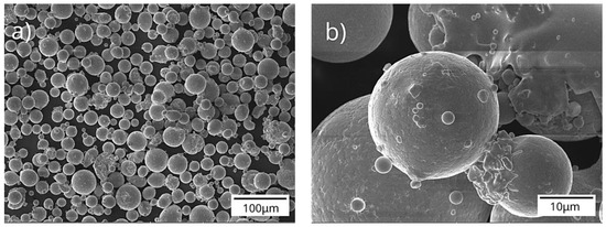 In this research, Inconel 718 powder provided by F3nice [34] was used for the L-PBF process. The powder was produced from recycled materials, namely leftovers from CNC machining, failed printed parts and disqualified powder, using vacuum induction-melting inert gas atomization (VIGA) technology. The samples are printed with an AMCM M290 (customised EOS M290) machine equipped with 1070 nm wavelength Ytterbium fibre laser. A stripe scanning strategy with laser power of 285 W was used in combination with 960 mm/s scan speed and 0.11 mm hatch distance, leading to a volumetric energy density (VED) of 67 J/mm3. To prevent oxidation during the L-PBF process, the samples were printed in an inert argon gas environment. The process parameters are summarised in Table 1. The recycled powder feedstock is in accordance to ASTM F3055 [35] and has a size distribution of 55.5 μm, 36 μm, and 23.2 μm corresponding to D90, D50 and D10 particle size distribution, respectively. The SEM micrographs showing the particle morphology is given in Figure 1.