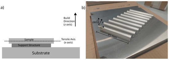 (a) Sample orientation (horizontal) for the L-PBF process, (b) AM samples. z-axis is the building direction (BD) and x-axis is the tensile axis.