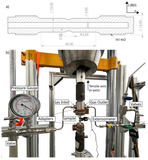 - Boot, T.; Riemslag, T.A.C.; Reinton, E.T.E.; Liu, P.; Walters, C.L.; Popovich, V. In-Situ Hollow Sample Setup Design for Mechanical Characterisation of Gaseous Hydrogen Embrittlement of Pipeline Steels and Welds. Metals 2021, 11, 1242. [Google Scholar] [CrossRef]