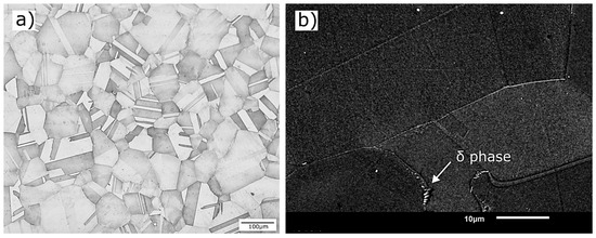 Figure 4 shows the microstructure of the conventional Inconel 718 sample after heat treatment with equiaxed grains and annealing twins. During the heat treatment, the solutionising temperature of 1032 °C is higher than the δ solvus temperature (~1000 °C) [12], resulting in the dissolution of the δ phase. Cai et al. [42] reported that after 1 h of holding time at 1020 °C the δ phase fully dissolves in the matrix. In the current study at high magnification (Figure 4b), precipitates of δ phase with a size of ~0.8 μm are seen along the grain boundaries. Nevertheless, the fraction of the δ phase observed is small, as it is found only in certain regions and not throughout the grain boundaries. The γ′ and γ″ strengthening phases form during the subsequent ageing heat treatment at 790 °C for 6 h. As these strengthening phases precipitate in the nanometre range, they are hard to discern in a scanning electron microscope.