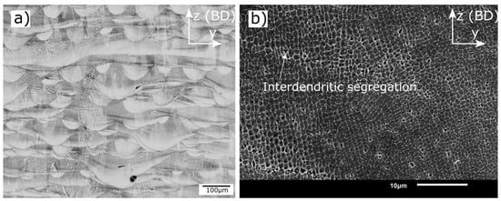 Along the building direction, the AM-AP sample shows fish-scale-like morphology (Figure 5a), arising from the remelting of previous layers during layer-wise deposition of material. Due to the presence of solidified layers, grain growth in L-PBF occurs epitaxially; this is seen as dendritic structures spanning multiple melt pools in the microstructure [20]. Figure 5b) shows the cellular structures of the columnar dendrites. Laves phase (marked by arrows) forms in the interdendritic regions due to the micro-segregation of Nb and Ti during solidification [43]. As these segregations are detrimental to mechanical properties, post-processing heat treatments are recommended [20].
