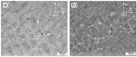 The microstructures of AM-AP and AM-HT, perpendicular to the build direction (xy-plane), are shown in Figure 7. Scan tracks representative of the scanning strategy are visible in the AM-AP samples. Wang et al. [47] performed EBSD analysis and reported that the grains appeared equiaxed in this plane. Popovich et al. [19,48] performed similar studies for functionally graded Inconel 718 and reported that laser power strongly influenced texture, in turn, affecting anisotropy in samples. It was also found that HIP treatment promoted recrystallisation, whereas annealing heat treatment at 850 °C did not. This supports the observation in Figure 7b) vaguely showing melt pools (marked by dotted line) after only heat treatment.