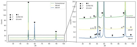 XRD analysis was performed to confirm the presence of different phases. Figure 8 shows the XRD measurement results for conventional, AM, and AM-HT. For all samples, the primary matrix phase (γ) shows the strongest peaks. Only qualitative phase analysis is performed, as most of the phases give peaks which overlap with the primary matrix, thus making it hard to distinguish them. In the conventional samples, small peaks identified as γ″ are seen close to the γ matrix peaks. Additionally, peaks corresponding to Ti, Nb—carbides are also visible. Even though the microstructure shows the presence of the δ phase, corresponding peaks were not identified in the XRD measurement; this is due to the poor resolution of XRD when the phase fractions are less than 5%.