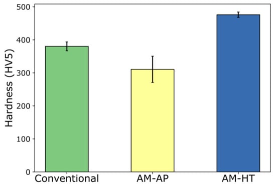 The Vickers hardness measurements of the samples are given in Figure 9. The conventional sample shows a hardness of 380 ± 13 HV5, which is in the expected range for the heat-treated wrought alloys [49]. In the case of AM samples, after heat treatment, the sample shows a hardness of 476 ± 8 HV5, which is 53% higher than the hardness of the AM-AP sample (310 ± 39 HV5). This is expected, as the heat treatment introduces γ′ and γ″ strengthening phases, which are absent in the as-processed condition [44]. On the other hand, even after the precipitation of γ′ and γ″ phases, the conventional sample shows a hardness value lower than AM-HT samples. The difference in the hardness of AM-HT and conventional samples can be attributed to the fine microstructure induced by the L-PBF process. This is evident when comparing Figure 4 and Figure 6, and is in agreement with data reported by Tanja et al. [50]: where the grain size of L-PBF Inconel 718 is reported to be finer than the forged counterpart by a factor of 10. The higher hardness values of AM-HT would correlate to a higher yield and tensile strength [51]. Thus, when considering hydrogen embrittlement, AM-HT is expected to have a higher degree of HE compared to AM-AP and conventional samples.