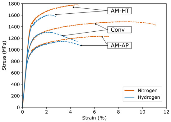 Embrittlement is observed in both conventional and AM samples when hydrogen was introduced. However, the degree of hydrogen embrittlement varies. A general observation for hydrogen samples which was not found in the literature was the drop in load after reaching particular stress. In a uniaxial tensile test, a load drop before failure signifies a reduction in load-bearing cross-sectional area or softening. As no significant load drop in the nitrogen test condition is observed it is unlikely that softening occurs. This can be further confirmed by looking at the fracture surface as occurs in a later section.