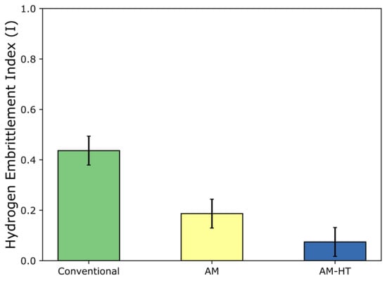 Hydrogen embrittlement index can serve as a quantitative comparison between conventional and AM samples. The hydrogen embrittlement index (HEI) of the samples are provided in Figure 12 with higher values signifying a higher degree of embrittlement. The AM samples show lower degree of embrittlement than the conventional samples. In the case of AM-AP samples, the difference could arise due to the absence of strengthening phases γ′ and γ″. Rezende et al. [53] studied the influence of γ″ precipitates on the HE behaviour and reported that its presence aggravated hydrogen embrittlement. Similar observations were also seen by Hesketh et al. [33], where the lower degree of HE was attributed to the lower tensile strength of AM-AP samples. In general metals having high tensile strength show a higher degree of hydrogen embrittlement [36]. Surprisingly in this study, the AM-HT samples, which demonstrate the highest yield strength, show the least embrittlement compared to AM-AP and conventional samples, thus deviating from the earlier mentioned trend. This behaviour could arise due to the unique anisotropic microstructure inherent to the L-PBF process, which could affect how hydrogen interacts with the material. To better understand this, the fracture surface is looked into to help identify the HE mechanisms.