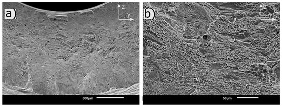 (a) Zoomed-out and (b) zoomed-in view showing characteristic ductile fracture with micro-voids in conventional Inconel 718 tested in nitrogen.