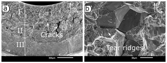 The conventional samples after hydrogen gaseous charging show severe embrittlement on the fracture surface, as seen in Figure 15. Additionally, it is noted that fracture initiates from the inner surface of the sample. Three distinct regions can be observed on the surface (Figure 15): (1) brittle intergranular region, (2) quasi-cleavage region and (3) ductile region. Severe cracking (marked by arrows) on the fracture surface is also seen.