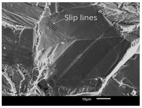To identify the dominant mechanism, the intergranular region on the fracture surface is analysed. On a macro scale, the brittle features point towards hydrogen-enhanced decohesion (HEDE) mechanism [17]. However, on taking a closer look at the facets, dislocation slip lines signifying plastic deformation are visible (Figure 16). This indicates a possibility for hydrogen-enhanced localised plasticity (HELP) or adsorption-induced dislocation emission (AIDE) mechanism [17]. AIDE is considered here as the hydrogen is present on the surfaces of the crack, which can be adsorbed leading to dislocation emission from the crack tip.