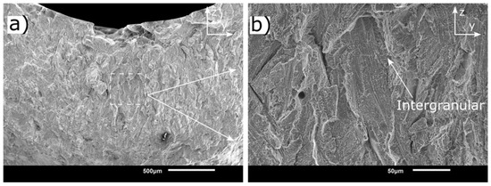 Another observation that needs to be accounted for is the load drop in the SSRT curves (Figure 11). It was found that the drop in load occurred only after a particular stress level is reached. As explained earlier this means a reduction in load-bearing area; here, it signifies the beginning of decohesion. The strain at this point was determined to be 2%. As Inconel 718 has a low stacking fault energy, it is found to show planar deformation [56]. The slip lines visible on the facets could be a consequence of this 2% strain. Further, it could also be possible that the decohesion occurred where the slip lines intersected with the grain boundaries. A cross-section of the fracture surface was analysed to understand it better.