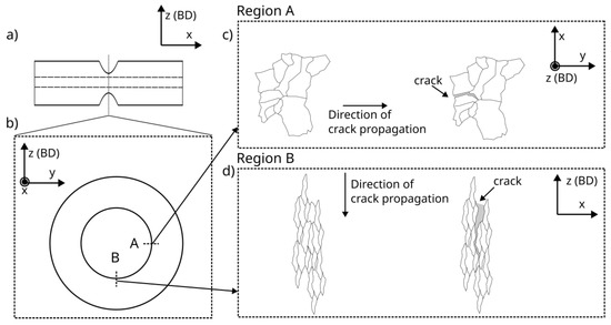 (a) Schematic of L-PBF sample showing area of interest (notch). (b) Cross-sectional view of the notch. (c) Crack propagation in xy-plane. (d) Crack propagation in xz-plane. z-axis is the build direction (BD) and x-axis is the tensile axis. The microstructure schematic is not to scale.