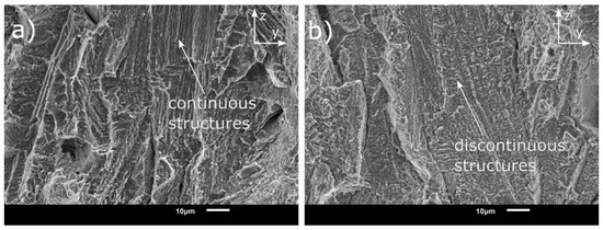 High magnification image of grain like features on the fracture surface of AM samples. (a) AM-AP showing continuous structures. (b) AM-HT showing discontinuous structures.