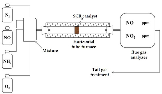 The experimental method was as follows: The tubular resistance furnace was started, the heating rate was set to 5 °C/min, and the temperature was kept constant for 1~2 h after reaching the target temperature. A certain amount of the catalyst was weighed, it was spread evenly on the quartz cotton, and the quartz cotton was placed in the quartz tube. At both ends of the sealed tube furnace, high-purity N2 was introduced to discharge other gases in the pipe, and then O2, NO and NH3 were introduced to regulate each gas at the required flow. The gas entered the catalytic reaction device after passing through the gas-mixing device. The mixed gas reacted with the catalyst, and the reaction gas entered the PTM600-3 gas analyzer. The analyzer used the pumping detection method to suck the gas in the environment into the instrument for detection. If the gas concentration in the environment was uniform and stable, the reading could be stable for about 30 s. The conceptual diagram of the whole installation is shown in Figure 1.