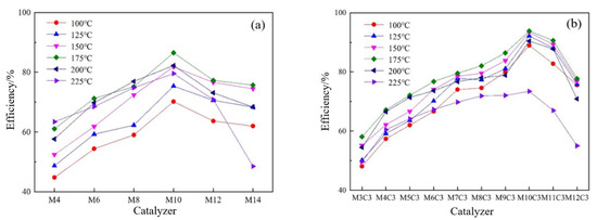 Figure 3b shows the denitration performance of catalysts 6~15 in Table 4. During the process of increasing the Mn content from 3% to 10%, the catalyst efficiency increased with the increase in the Mn content, and the Mn content continued to increase. The denitration efficiency of the Mn-Ce catalysts began to decrease, and the most efficient catalyst was still M10C3. With Figure 3a,b, it is not difficult to see that adding either Mn or Mn and Ce together improves the catalytic efficiency of the catalyst. However, the improvement in the catalytic efficiency is limited, and an excessive load reduces the denitration efficiency of the catalyst.
