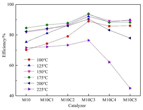 The denitration performance changes in catalysts 1~5 and M10 in Table 4 were tested in the temperature range of 100~225 °C. The effect of the Ce content on the denitration performance of the catalysts is shown in Figure 4. The denitration performance of the catalyst loaded with Mn and Ce was improved compared with that of the catalyst only loaded with Mn. The catalytic efficiency of the catalyst increased first and then decreased with the increase in the Ce content. When the Ce content was 3%, the maximum efficiency of the catalyst could reach 93.86%. When the Ce content increased to 4% and 5%, the denitration efficiency of the catalyst started to decrease gradually.