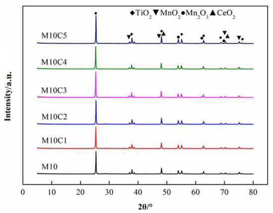 The XRD spectra of catalysts M10 and M10C1~M10C5 are shown in Figure 5. Due to the high content of TiO2, the main characteristic peak of the catalysts was anatase-type TiO2, and the characteristic peak of TiO2 partially overlapped with that of MnOx and CeO2. The diffraction peaks of MnO2 and Mn2O3 can be observed in the XRD pattern, which occurred at 2θ = 37°, 48.4°, 74.7° and near 76.1° and at 2θ = 55.3°, 62.3°, 69° and 70.8°. Due to the low amount of doped Ce, the diffraction peak of CeO2 was observed only in the diffraction pattern of the M10C5 catalyst at 2θ = 48° and around 70.5°. The peak type of the added active material oxides was not as obvious as that of TiO2, which indicates that the oxide formed by the added active material distributed uniformly without obvious aggregation [22].