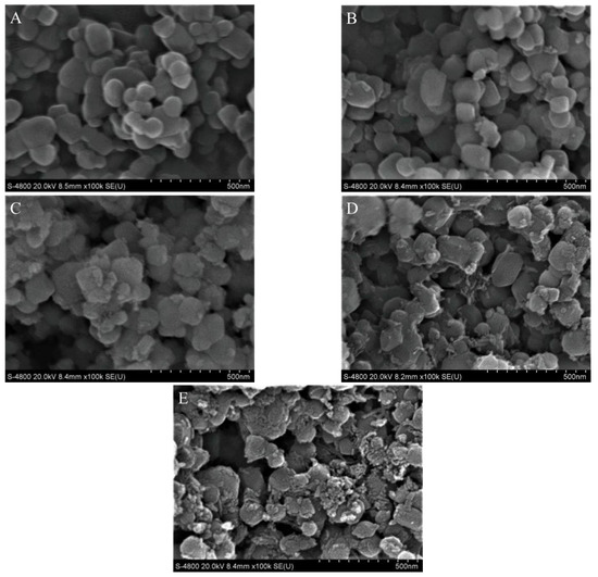 The morphology of the TiO2, M10, M10C1, M10C3 and M10C5 catalysts is shown in Figure 6. Figure 6A shows the TiO2 powder. TiO2 is a uniform, round, elliptical and smooth particle with a particle size of 50–100 nm. After loading Mn, compared with the surface of pure TiO2, some finer particles attached to the surface of the M10 catalyst, resulting in unsmooth bumps. After loading Mn and Ce, it could be seen that the surface of the TiO2 particles was rougher, and there were almost no smooth TiO2 particles. The active substances were highly dispersed but also produced a small amount of agglomeration. With the increase in Ce loading, the surface roughness of the catalyst also increased. The active substances were uniformly attached to the surface of the TiO2 particles, providing more pores. Figure 6E shows the M10C5 catalyst. Excessive Ce loading caused serious agglomeration on the surface of the catalyst, and the distribution of mesopores was uneven. Excessive Ce doping led to the sintering and agglomeration of some active substances and pore plugging, which was not conducive to the adhesion of gas molecules [23]. According to the analysis of the experimental results, a proper amount of active material agglomeration is conducive to the catalytic reaction, whereas an excessive amount of active material agglomeration affects the performance of the catalyst.