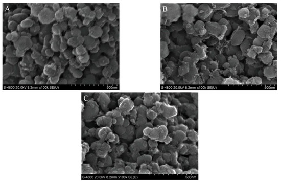 SEM of Mn-Ce catalysts: (A) M8C3; (B) M10C3; (C) M12C3.