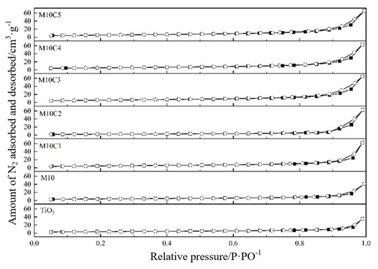After loading Mn or Mn-Ce on the TiO2 powder, the specific surface area of the catalysts was improved to varying degrees compared with that of TiO2. The pore volume and pore size of the catalyst loaded with a single Mn element were lower than those of TiO2, and the pore volume of the catalyst loaded with Mn and Ce was higher than that of TiO2. The pore size of the Mn-Ce catalysts, except for M10C5, significantly increased compared with that of TiO2. The surface parameters of TiO2 and various catalysts are shown in Table 3. It can be seen from Table 5 that the specific surface area of the TiO2 powder was only 12.53 m2·g−1. After adding 10% Mn, the specific surface area slightly increased to 13.10 m2·g−1. After adding Mn and Ce at the same time, the specific surface area was significantly increased. The catalyst with 10% Mn and 3% Ce content had the largest specific surface area, which was 55.9% higher than that of TiO2. As the Ce content continued to increase, the specific surface area of the catalyst began to decrease.