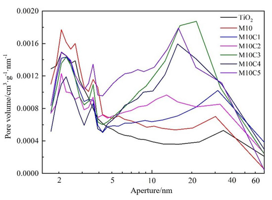 Similar to the change in pore volume, the addition of Mn reduced the average aperture of TiO2, which may have been due to the adhesion of Mn oxide on the surface of TiO2 particles, making the pore size between particles decrease or even disappear. After Ce was added, the pore size increased significantly, and the average aperture of the M10C3 catalyst with the best catalytic efficiency was 3.2% higher than that of TiO2. However, from the data, there was no obvious relationship between the change in the average aperture and the amount of Ce added.