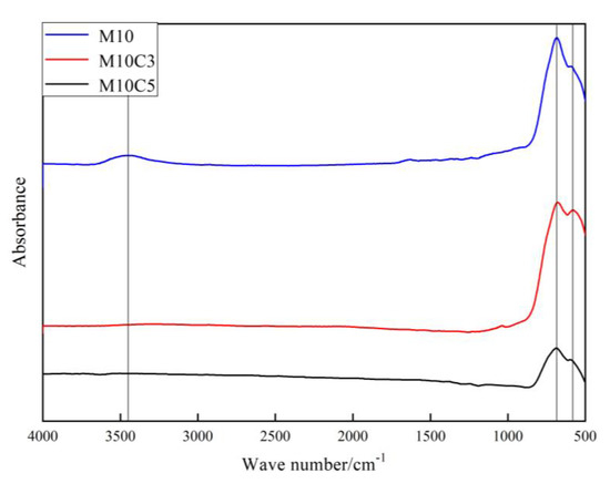 The Fourier infrared spectra of the M10, M10C3 and M10C5 catalysts are shown in Figure 11. It can be seen from the figure that the characteristic peak of the M10 catalyst at about 3460.63 cm−1 disappeared after Ce was added. With the addition of and increase in Ce, the two characteristic peaks at about 593 cm−1 and 684 cm−1, respectively, represented a reduction in the area of the Mn-O stretching vibration peak in Mn2O3 and MnO2. The results show that the doping of Ce affected the O-H bond on the surface of the catalyst, the interaction between Ce and Mn, and the vibration intensity of Mn-O, and the relative content of MnOx decreased.