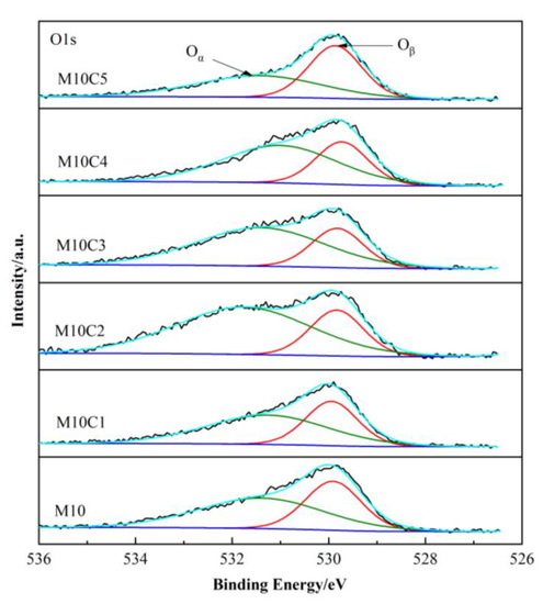 Figure 12 shows the O1s XPS spectra of some catalysts. The O1s spectra of the catalysts were fitted as two characteristic peaks representing the Oα and Oβ of chemisorbed oxygen on the surface of the catalysts [2], which were located at 529.9 eV and 531.4 eV, respectively. It can be seen from the diagram that the peak area of Oα increased significantly with the increase in the Ce content. When the Ce content reached 2%, the peak area of Oα began to decrease. Table 6 shows the relative content of O on the surface of the catalyst. The ratio of Oα/Oα+ Oβ increased first and then decreased with the increase in the Ce content. The literature review shows that Oα is more active than Oβ and more conducive to the reaction [26]. The changes reflected by the XPS spectra are in agreement with the experimental results.
