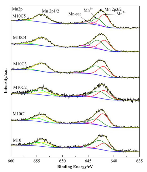 Figure 13 shows the XPS spectrum of the Mn2p orbital of the M10~M10C5 catalysts. The Mn2p orbital of the catalysts has two characteristic peaks, Mn2p1/2 and Mn2p3/2 [27], which are located at 638.6 eV and 649.9 eV, respectively. Mn exists as Mn3+, Mn4+ and Mn-sat [28]. It is known from the literature that Mn4+ is more active in the catalytic reaction [29].